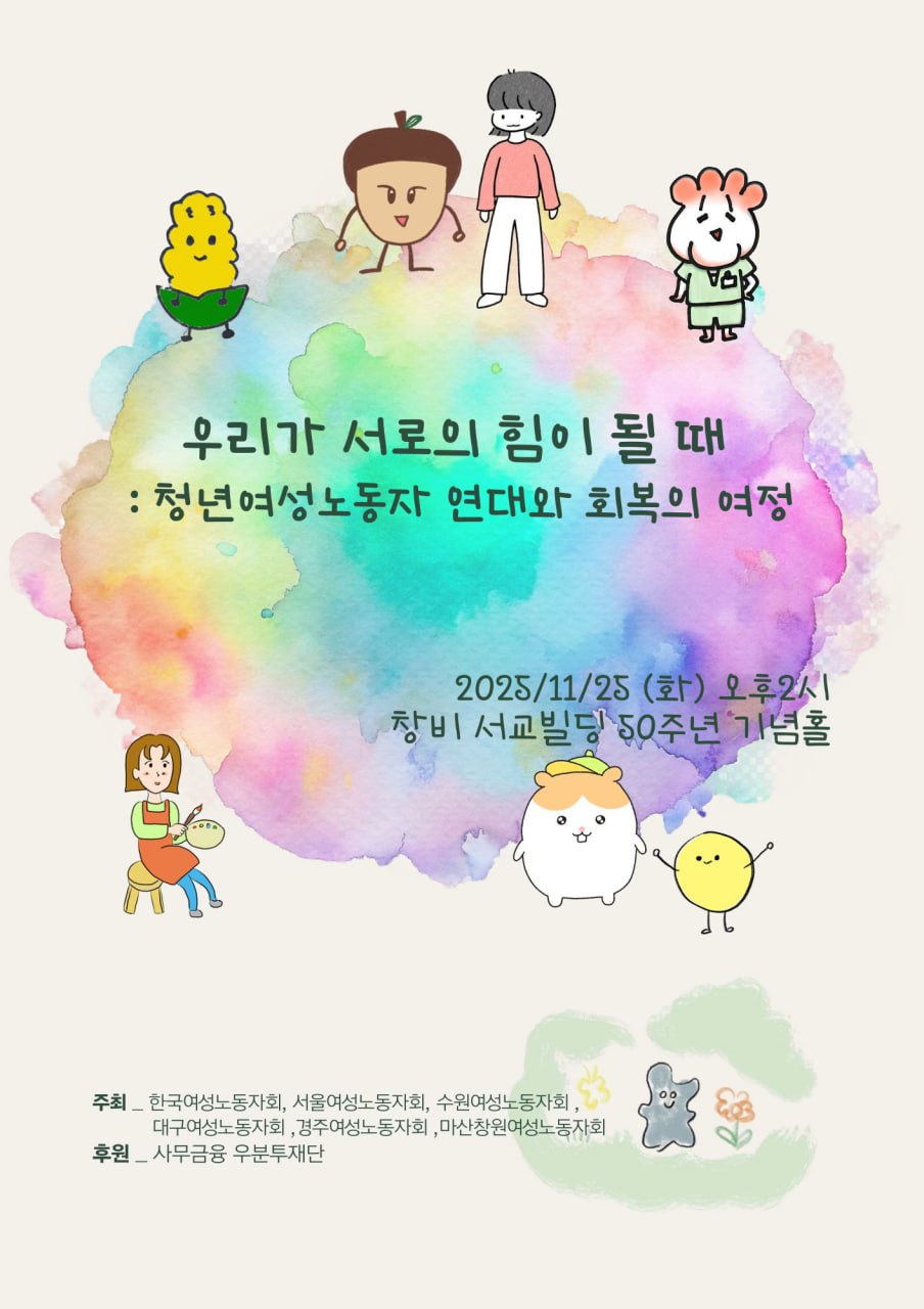 여성노동자회가 2022년 90년대생 여성노동자 실태조사를 진행(유효응답자만 무려 4774명이었다)하고, 이후 심층 분석연구를 진행한 결과 중등도 이상의 우울정도를 보인 사람이 전체 응답자의 14.3%, 매우 심한 우울정도(중증)를 보인 응답자가 7.6%였다. '위기를 넘어 비상상태인' 청년여성의 현실을 마주한 여성노동자회 활동가들이 우리가 무엇을 할 수 있을지 의견을 수렴하던 차에 든든한 지원군이 나섰다. 사무금융 우분투재단이 2023년부터 2025년까지 3년에 걸쳐 청년여성노동자 회복을 위한 펀더로 역할을 약속한 것이다.