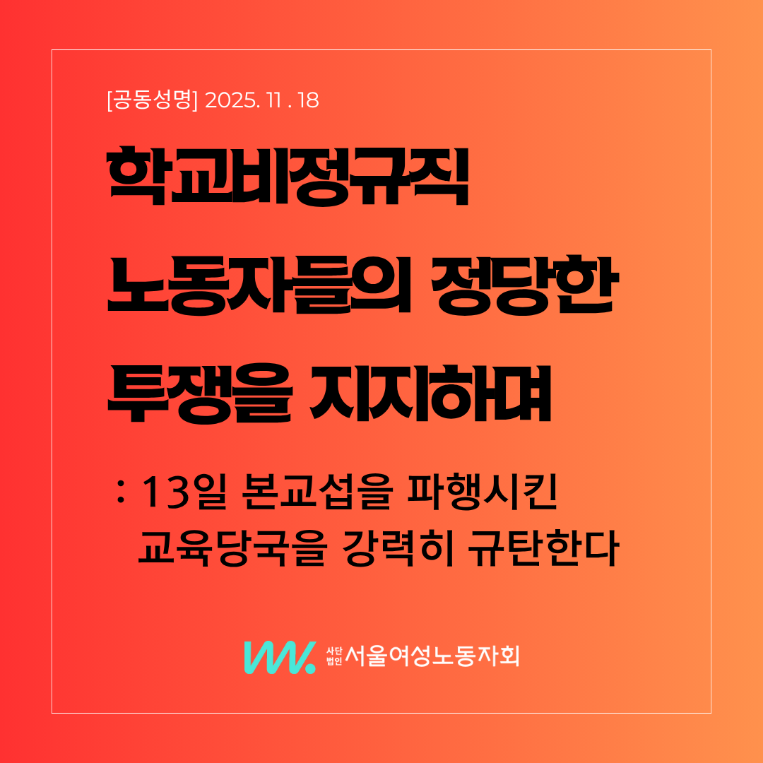 특히 약 9만 명에 달하는 방중비근무자 문제는 학교비정규직 노동자들이 겪는 심각한 저임금 구조의 상징이다. 교육청이 자의적으로 방학 중 임금을 지급하지 않는 고용형태로 분류해온 문제에 대해 국회에서도 생계지원 대책 마련을 지속적으로 요구해 왔지만, 교육당국은 여전히 아무런 전향적 안을 내놓지 않고 있다. 여성노동자가 대다수인 학교 현장에서 이러한 저임금 구조가 반복되는 것은 명백한 성차별 구조의 지속이다. (후략)